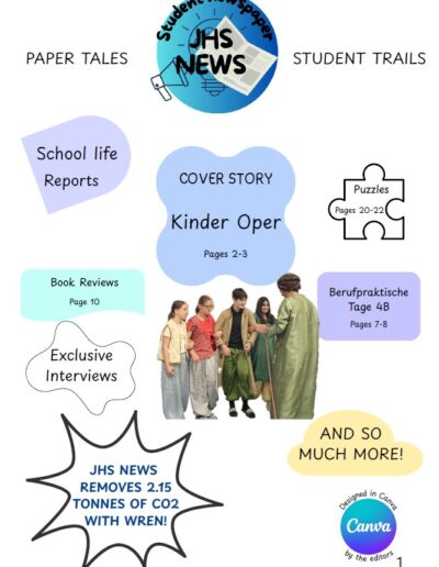 In der JHS NEWS schreiben die Nachwuchsjournalist:innen über verschiedene Themen rund um die Schule, Ausflüge und Projektwochen, aber auch aktuelle Entwicklungen in der Welt, Bands, Bücher und Filme, die sie interessieren, und vieles mehr. Die neuen Ausgaben werden immer in der Schule aber auch bei Schulfesten verkauft.